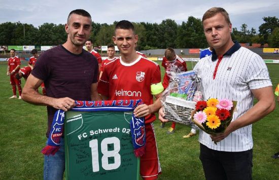 Am ersten Spieltag der neuen Landesliga-Saison: Nach 205 Pflichtspielen, in denen er 105 Treffer erzielt hat, ist Marcin Lapinski am Sonnabend beim FC Schwedt verabschiedet worden. Interims-Kapitän Michal Adamczak und Vorstandsmitglied Silvio Pohlmann überreichten ihm ein von allen Mitspielern signiertes Trikot mit seiner Stammnummer 18 sowie einen FCS-Fanschal.